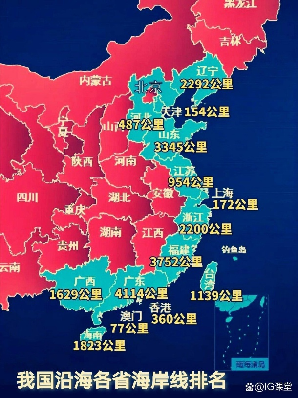 如果仅算陆地海岸线,我国海岸线最长的省份是广东,海岸线总长度4100公里左右。其次是福建,陆地海岸线3700公里左右。第三名是山东,山东海岸线长度大约3200公里。