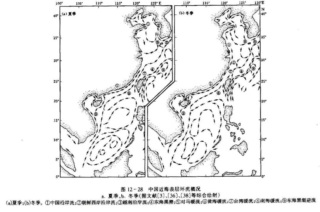 渤海的环流较其他海区为弱,海流的速度一般为0.1~0.2m/s。黄海的海流也比东海弱得多,黄海暖流是黄海环流的重要组成部分,在成山角一带流幅变窄、流速增大。东海的环流,脉络比渤海、黄海更清晰,东海黑潮约占黑潮总流径的一半,是黄-东海总环流的主干,黑潮在东海的平均流量约为长江径流的1000倍。南海是太平洋中季风环流最发达的海域,其总的特点是:西南季风期间盛行东北向漂流,东北季风期间则为西南向漂流。