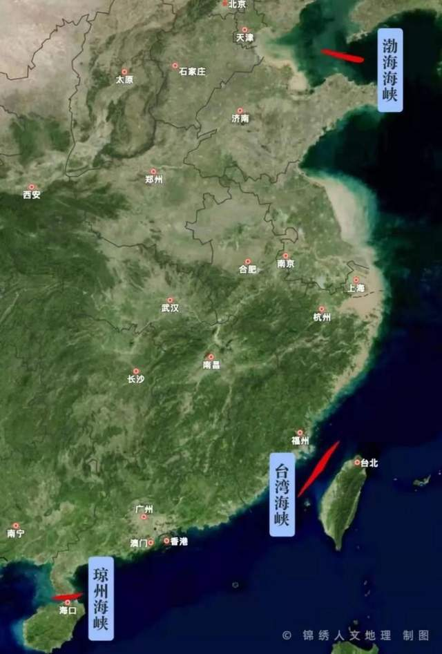 我国三大海峡:渤海海峡、台湾海峡、琼州海峡。渤海海峡位于山东半岛和辽东半岛之间,是连接黄海和渤海的唯一通道;台湾海峡位于中国台湾岛与福建省之间,连接东海和南海;琼州海峡位于海南岛与广东省雷州半岛之间,是进入北部湾的海上要冲。