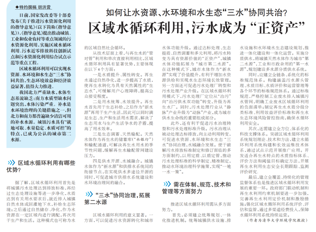 区域水循环利用可以实现水资源、水环境和水生态“三水”协同共治,生态环境效益和经济效益显著,值得大力推进。