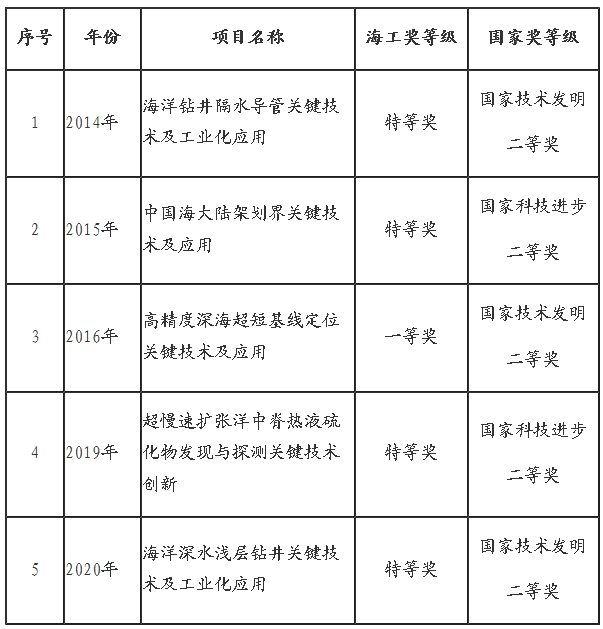 自2014年开始,中国海洋工程咨询协会具备直接提名国家科技奖的资格,已成功提名国家奖5项,其中国家技术发明奖3项,国家科技进步奖2项。
