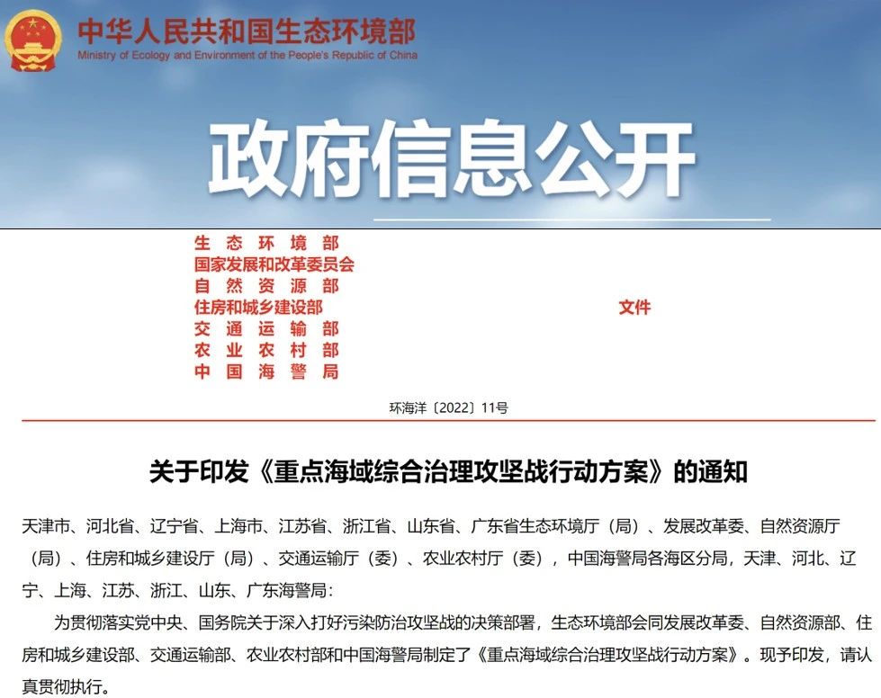 2022年1月,为贯彻落实党中央、国务院关于深入打好污染防治攻坚战的决策部署,生态环境部会同发展改革委等六部门印发实施《重点海域综合治理攻坚战行动方案》。
